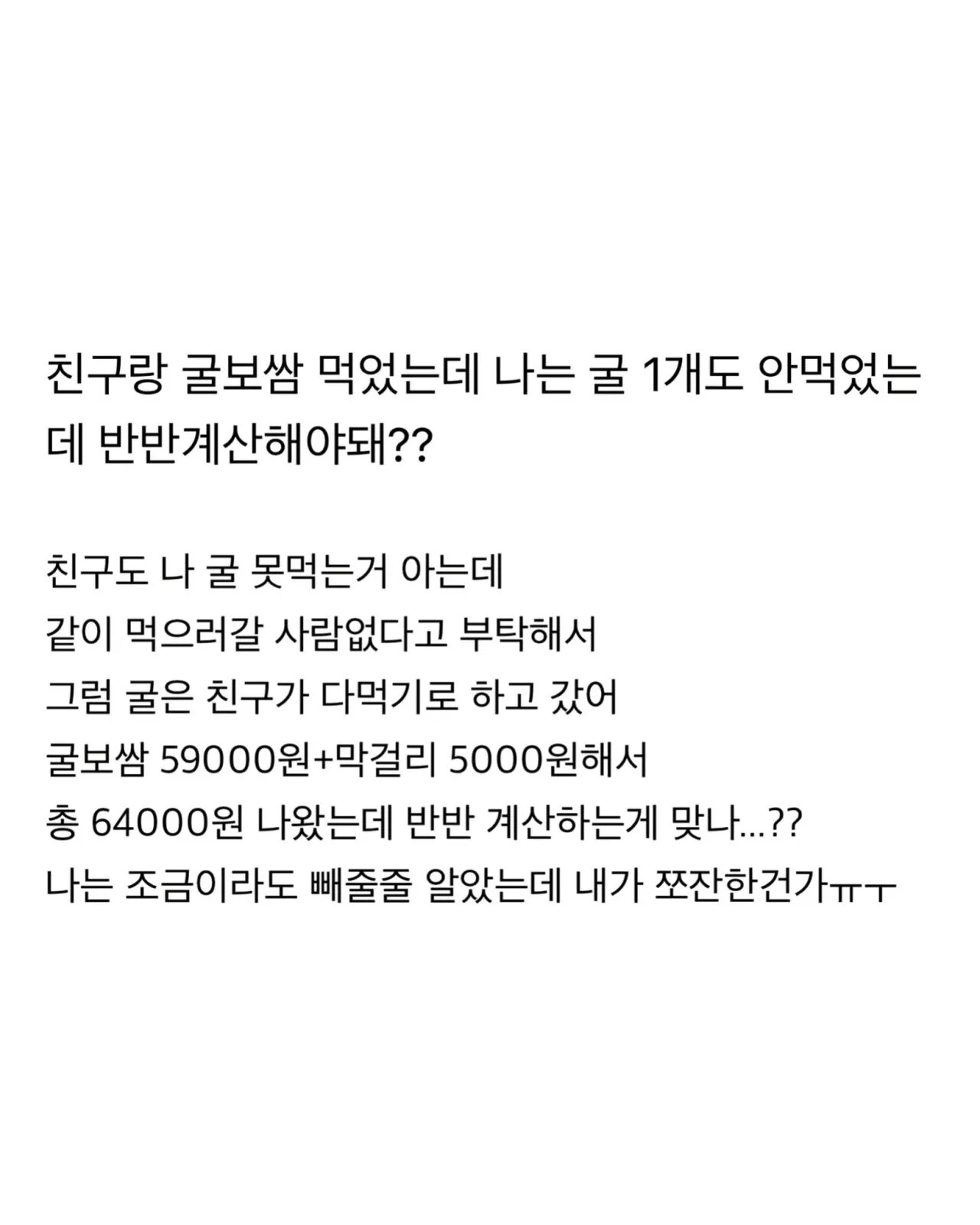 굴보쌈 굴 안 먹었는데 반반 계산해야 돼? 작성자 정보 최고관리자 작성일 01.02 17:59 컨텐츠 정보 3 조회 0 댓글 0 추천 0 비추천 목록 0 추천 추천 비추천 0 비추천 댓글 로그인한 회원만 댓글 등록이 가능합니다. 이전 다음 목록