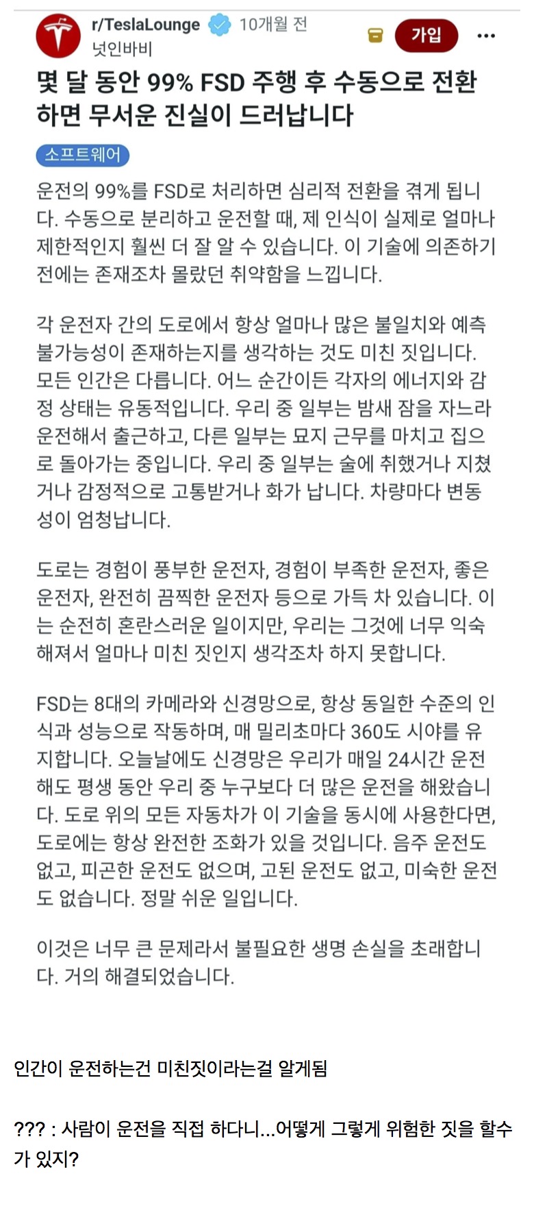 몇달간 99% FSD 운전 후 수동을 해보고 깨달았다는 차주 작성자 정보 최고관리자 작성일 2025.12.09 13:21 컨텐츠 정보 7 조회 0 댓글 0 추천 0 비추천 목록 0 추천 추천 비추천 0 비추천 댓글 로그인한 회원만 댓글 등록이 가능합니다. 이전 다음 목록