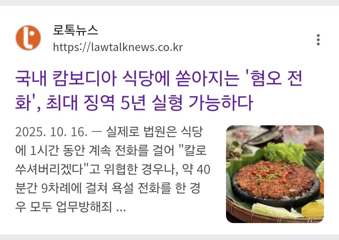 국내 캄보디아 식당에 욕설 전화... 길거리에서는 캄보디아인 폭행 작성자 정보 최고관리자 작성일 2025.12.07 22:36 컨텐츠 정보 16 조회 0 댓글 0 추천 0 비추천 목록 0 추천 추천 비추천 0 비추천 댓글 로그인한 회원만 댓글 등록이 가능합니다. 이전 다음 목록