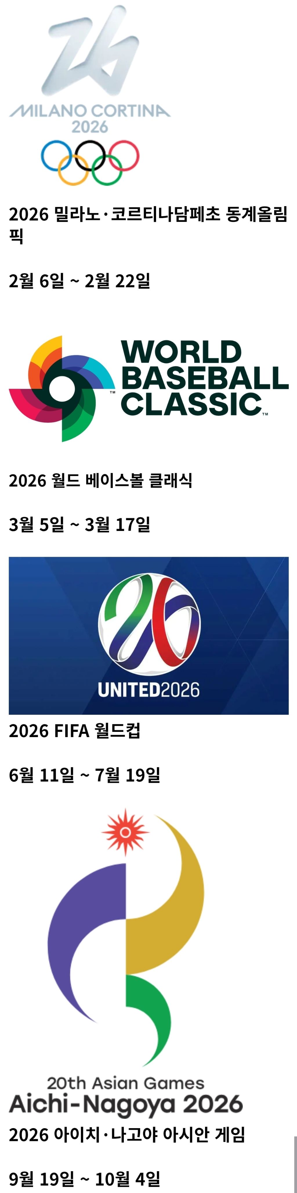 2026년 열리는 스포츠 대회들 작성자 정보 최고관리자 작성일 01.02 02:53 컨텐츠 정보 8 조회 0 댓글 0 추천 0 비추천 목록 0 추천 추천 비추천 0 비추천 댓글 로그인한 회원만 댓글 등록이 가능합니다. 이전 다음 목록