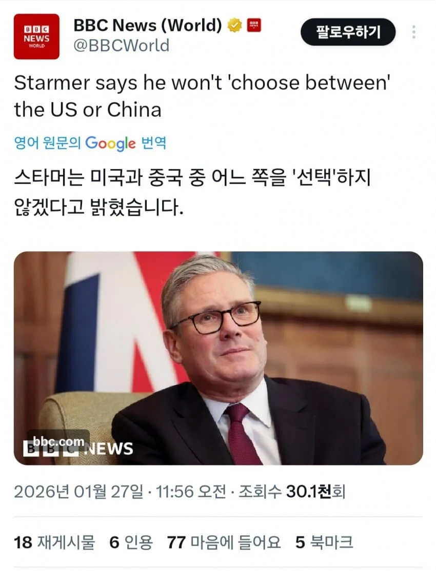영국 총리 : 이제는 미국의 동맹국이 아니다 작성자 정보 최고관리자 작성일 01.27 15:35 컨텐츠 정보 11 조회 0 댓글 0 추천 0 비추천 목록 0 추천 추천 비추천 0 비추천 댓글 로그인한 회원만 댓글 등록이 가능합니다. 이전 다음 목록