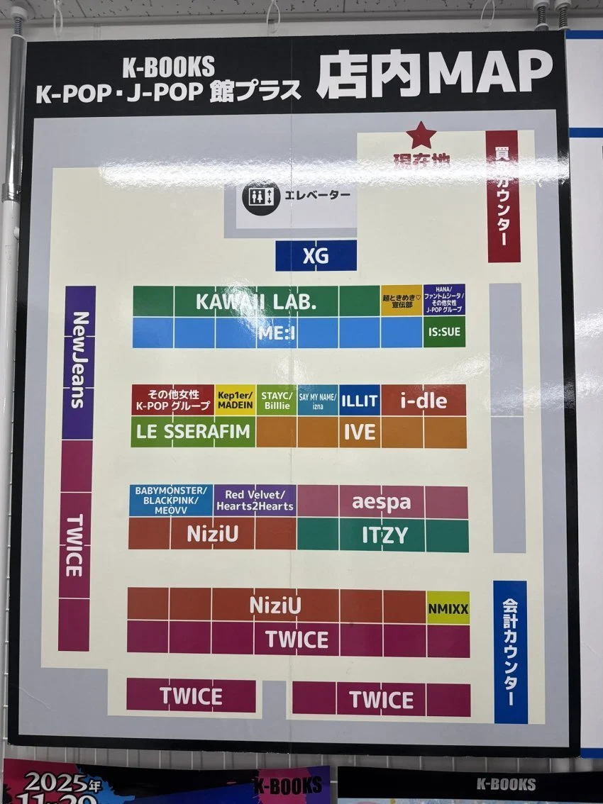 일본 매장내 K-POP관 걸그룹 지도 작성자 정보 최고관리자 작성일 2025.12.03 00:20 컨텐츠 정보 9 조회 0 댓글 0 추천 0 비추천 목록 리뉴얼하고 새로 오픈한 K-POP관 걸그룹 매대 트와이스 19칸 니쥬 11칸 (JYP 일본 현지화 그룹) 미아이 7칸 (일본판 프로듀스101) 아이브 5칸 있지 4칸 에스파 4칸 르세라핌 3칸 뉴진스 3칸 나머지 1~2칸 0 추천 추천 비추천 0 비추천 댓글 로그인한 회원만 댓글 등록이 가능합니다. 이전 다음 목록