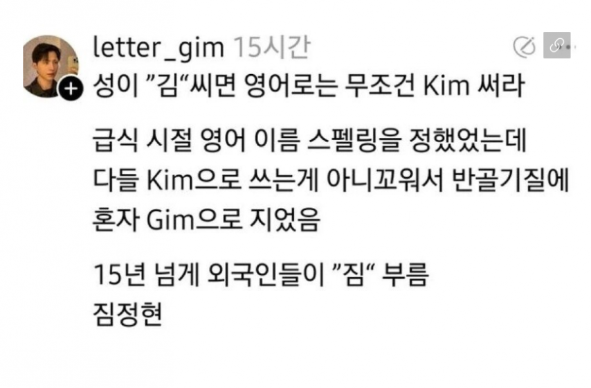 성이 김씨면 영어 무조건 KIM으로 써라 작성자 정보 최고관리자 작성일 2025.12.01 22:38 컨텐츠 정보 19 조회 0 댓글 0 추천 0 비추천 목록 0 추천 추천 비추천 0 비추천 댓글 로그인한 회원만 댓글 등록이 가능합니다. 이전 다음 목록