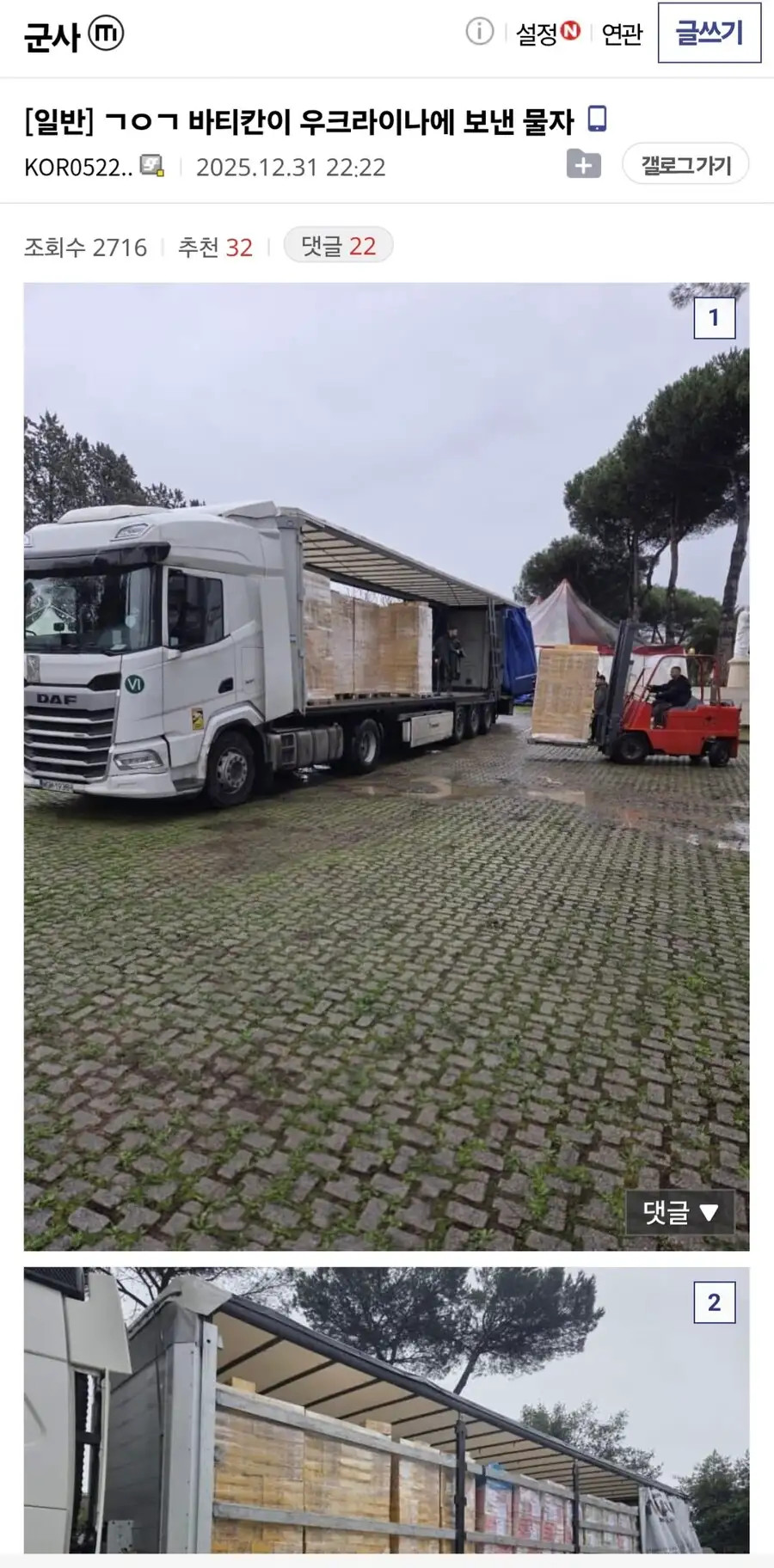 교황청이 우크라이나에 보낸 구호물자 작성자 정보 최고관리자 작성일 01.01 14:52 컨텐츠 정보 9 조회 0 댓글 0 추천 0 비추천 목록 0 추천 추천 비추천 0 비추천 댓글 로그인한 회원만 댓글 등록이 가능합니다. 이전 다음 목록