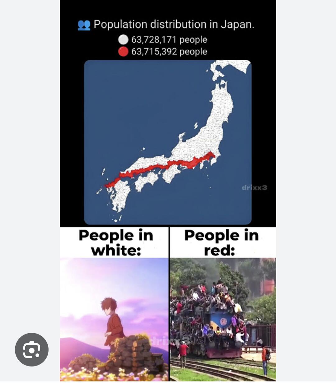 일본 인구 관련된 농담 작성자 정보 최고관리자 작성일 2025.11.27 13:14 컨텐츠 정보 31 조회 0 댓글 0 추천 0 비추천 목록 설명 저 위 일본 땅에서 빨간색의 좁은 영역에 사람들이 많이 몰려살음 하얀색 넓고 널널한 영역은 감성 애니에 나오는 그런 곳 같음 빨간색 좁고 밀집한 영역은 무슨 인도마냥 바글바글 0 추천 추천 비추천 0 비추천 댓글 로그인한 회원만 댓글 등록이 가능합니다. 이전 다음 목록