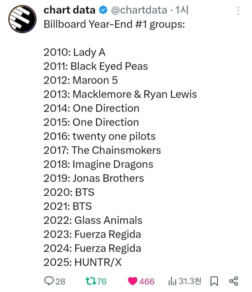 빌보드 2025년 역대 연간 1위 그룹 작성자 정보 최고관리자 작성일 2025.12.31 20:49 컨텐츠 정보 7 조회 0 댓글 0 추천 0 비추천 목록 0 추천 추천 비추천 0 비추천 댓글 로그인한 회원만 댓글 등록이 가능합니다. 이전 다음 목록
