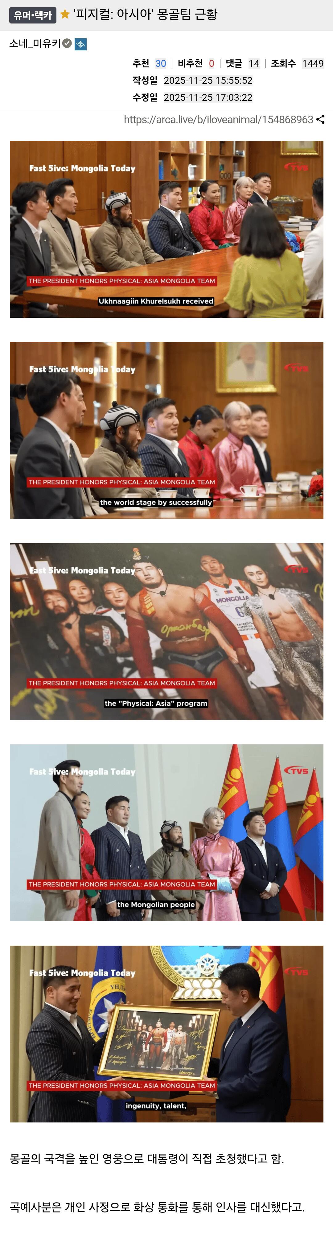 피지컬 아시아 몽골팀 근황. 작성자 정보 최고관리자 작성일 2025.11.25 21:01 컨텐츠 정보 140 조회 0 댓글 0 추천 0 비추천 목록 0 추천 추천 비추천 0 비추천 댓글 로그인한 회원만 댓글 등록이 가능합니다. 이전 다음 목록
