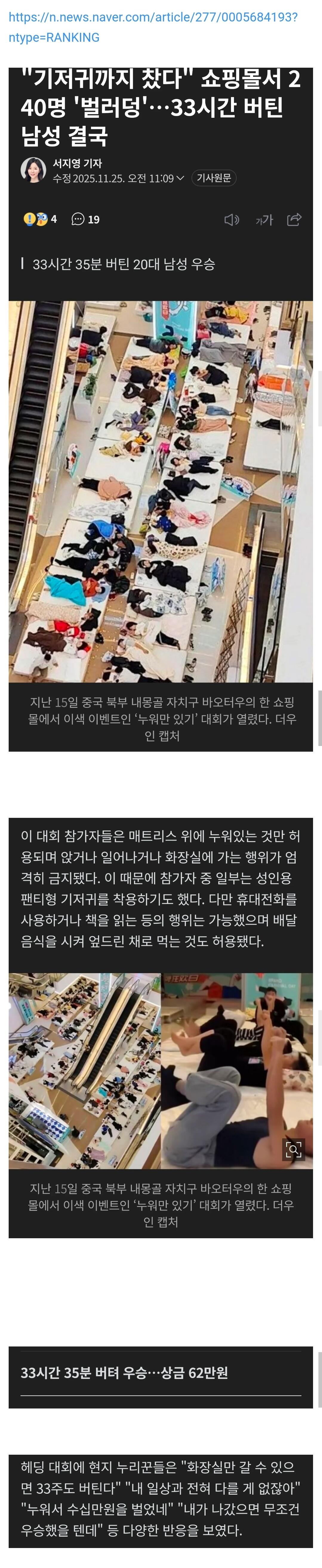 '누워만 있기' 대회 33시간 우승 작성자 정보 최고관리자 작성일 2025.11.26 00:34 컨텐츠 정보 134 조회 0 댓글 0 추천 0 비추천 목록 0 추천 추천 비추천 0 비추천 댓글 로그인한 회원만 댓글 등록이 가능합니다. 이전 다음 목록