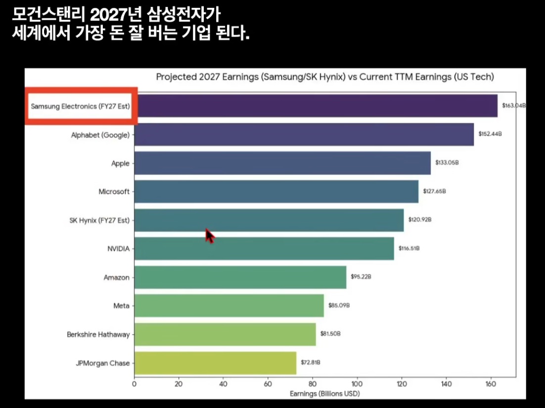 모건스탠리 2027년 삼성전자가 세계에서 가장 돈 잘버는 기업이 된다 작성자 정보 최고관리자 작성일 02.03 06:03 컨텐츠 정보 19 조회 0 댓글 0 추천 0 비추천 목록 1위 삼성 5위 하이닉스 https://youtu.be/jp3p_57FOIY?si=aY6upH9qEyFmFZxi 0 추천 추천 비추천 0 비추천 댓글 로그인한 회원만 댓글 등록이 가능합니다. 이전 다음 목록