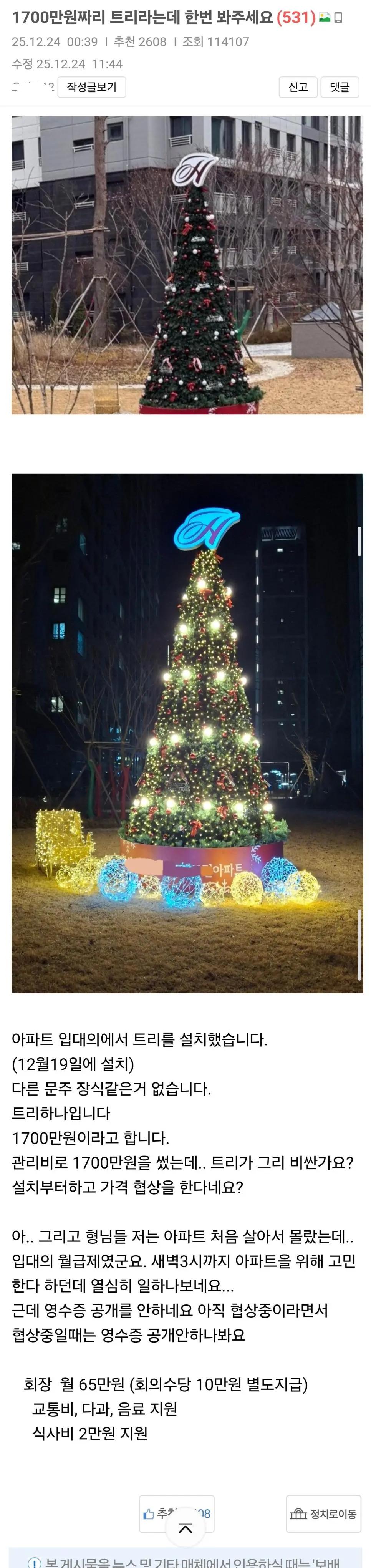 어느 아파트에 설치된 1700만원짜리 크리스마스 트리 작성자 정보 최고관리자 작성일 2025.12.28 19:41 컨텐츠 정보 9 조회 0 댓글 0 추천 0 비추천 목록 0 추천 추천 비추천 0 비추천 댓글 로그인한 회원만 댓글 등록이 가능합니다. 이전 다음 목록