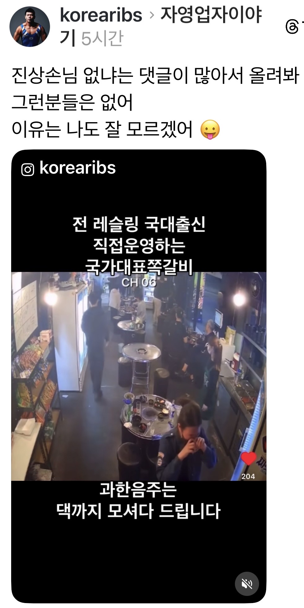 진상 손님이 없다는 전 국가대표 레슬링 선수가 운영하는 쪽갈비 식당 작성자 정보 최고관리자 작성일 01.31 18:51 컨텐츠 정보 26 조회 0 댓글 0 추천 0 비추천 목록 0 추천 추천 비추천 0 비추천 댓글 로그인한 회원만 댓글 등록이 가능합니다. 이전 다음 목록