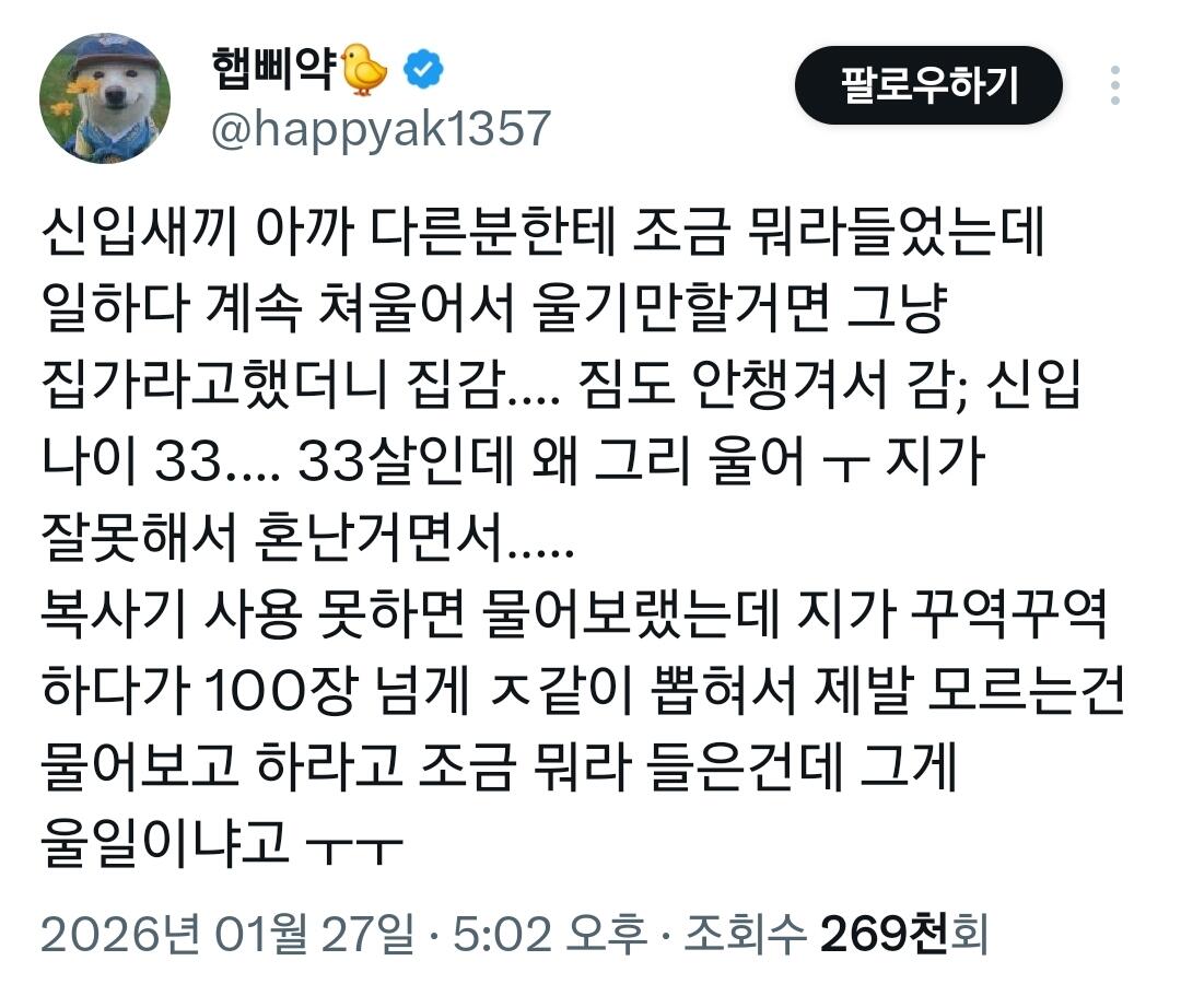 33살 신입 울다가 집감 작성자 정보 최고관리자 작성일 01.31 02:55 컨텐츠 정보 21 조회 0 댓글 0 추천 0 비추천 목록 아무리 그래도 울거면 집에나 가라한건 선 넘었다vs집 가란다고 진짜 가냐 속터져 뒤짐 0 추천 추천 비추천 0 비추천 댓글 로그인한 회원만 댓글 등록이 가능합니다. 이전 다음 목록