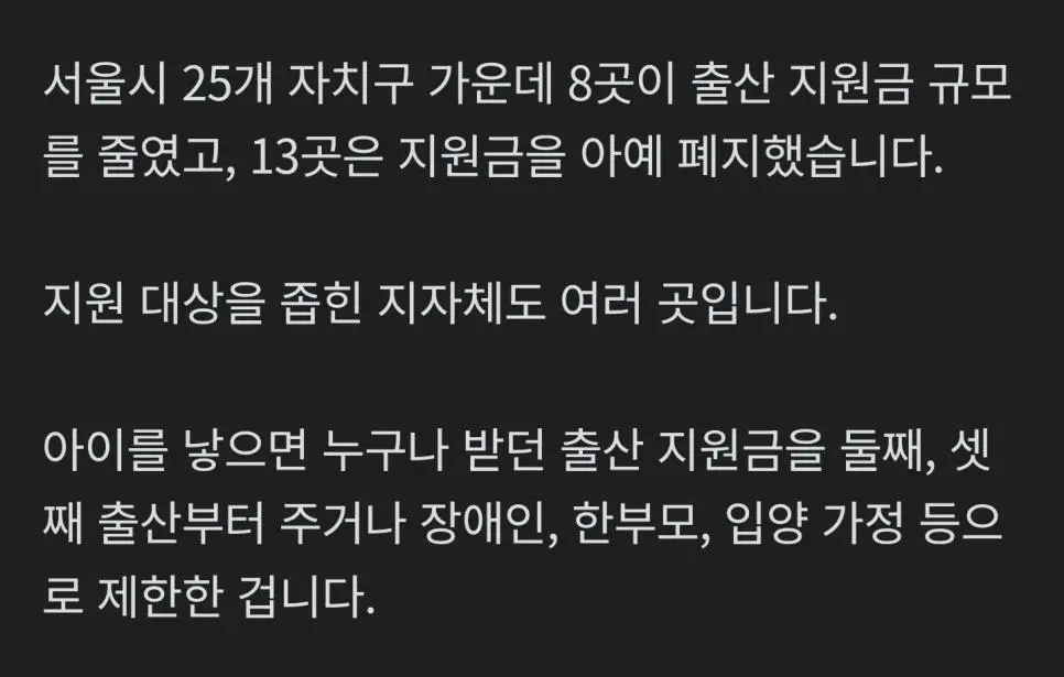 서울시 출산지원금 폐지중 작성자 정보 최고관리자 작성일 2025.12.27 09:43 컨텐츠 정보 3 조회 0 댓글 0 추천 0 비추천 목록 0 추천 추천 비추천 0 비추천 댓글 로그인한 회원만 댓글 등록이 가능합니다. 이전 다음 목록