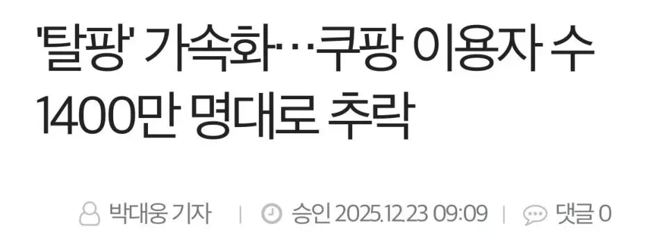 '탈팡' 가속화,쿠팡 이용자 수 1400만 명대로 추락 작성자 정보 최고관리자 작성일 2025.12.24 15:52 컨텐츠 정보 11 조회 0 댓글 0 추천 0 비추천 목록 대한민국 국민을 졸로 보는 기업은 사라져야 할듯... https://www.opinionnews.co.kr/news/articleView.html?idxno=130040 0 추천 추천 비추천 0 비추천 댓글 로그인한 회원만 댓글 등록이 가능합니다. 이전 다음 목록