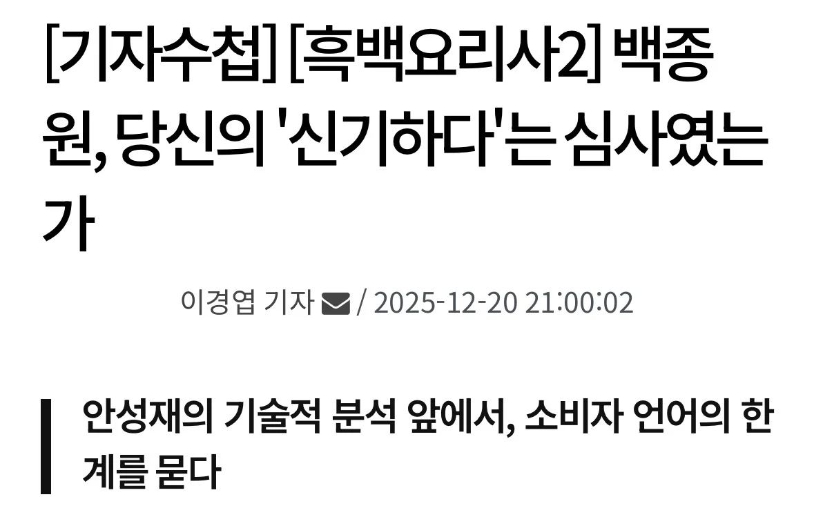 백종원 당신의 ‘신기하다’는 심사였는가? 작성자 정보 최고관리자 작성일 2025.12.21 18:48 컨텐츠 정보 10 조회 0 댓글 0 추천 0 비추천 목록 0 추천 추천 비추천 0 비추천 댓글 로그인한 회원만 댓글 등록이 가능합니다. 이전 다음 목록