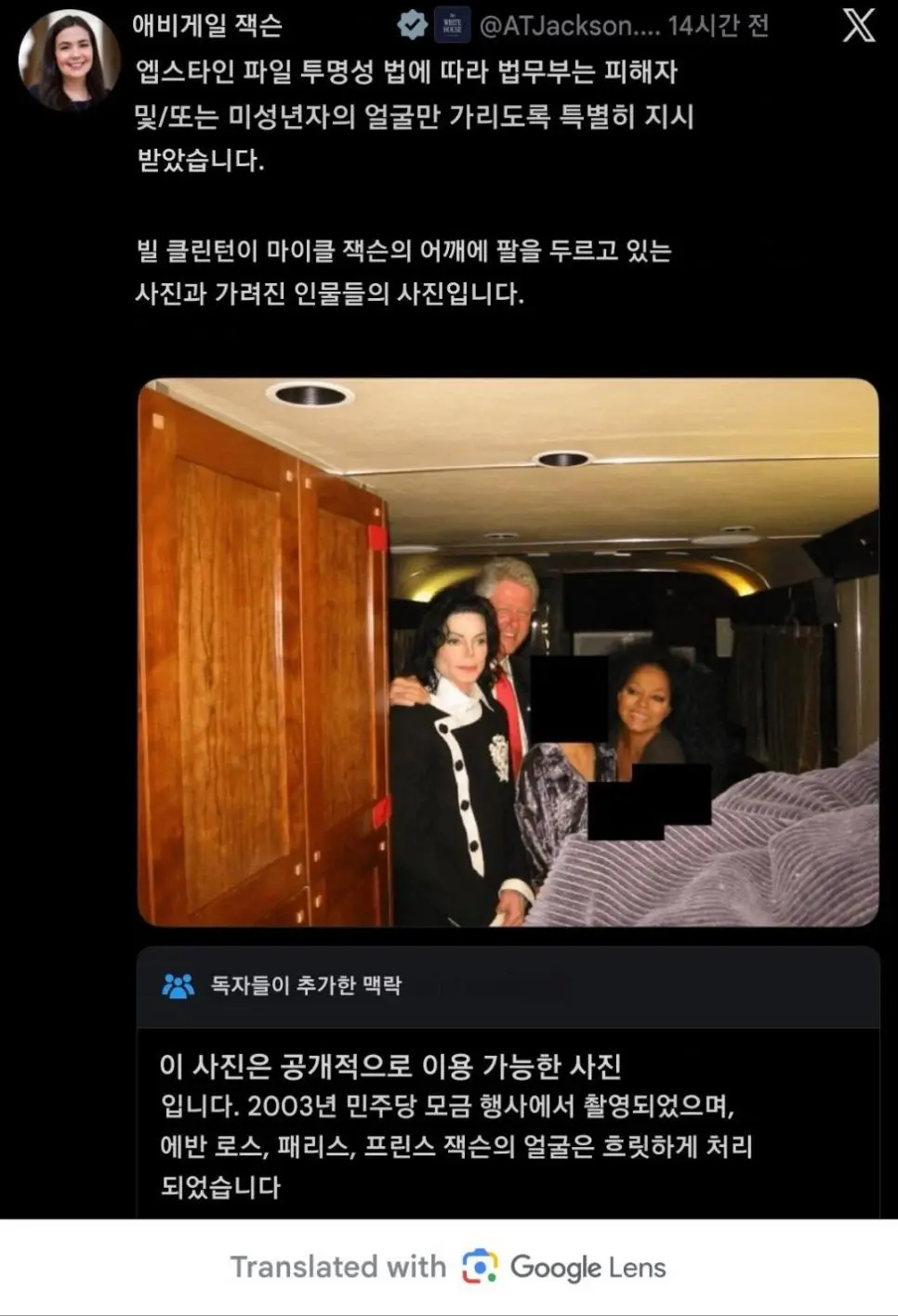 이 사진은 엡스타인 파일이랑 1도 상관이 없는 민주당 모금 행사에서 촬영된 것이며, 검열처리 된 아이들도 다이애나 로스나 마잭의 자녀였다는 사실이 밝혀져 논란이 되는 중