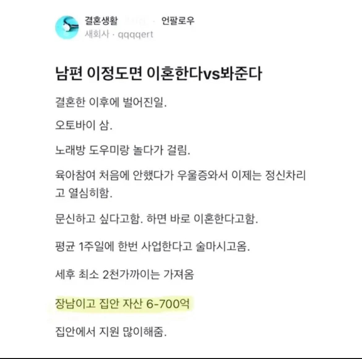 남편이 이정도면 이혼한다 vs 봐준다 작성자 정보 최고관리자 작성일 2025.12.19 10:37 컨텐츠 정보 6 조회 0 댓글 0 추천 0 비추천 목록 0 추천 추천 비추천 0 비추천 댓글 로그인한 회원만 댓글 등록이 가능합니다. 이전 다음 목록