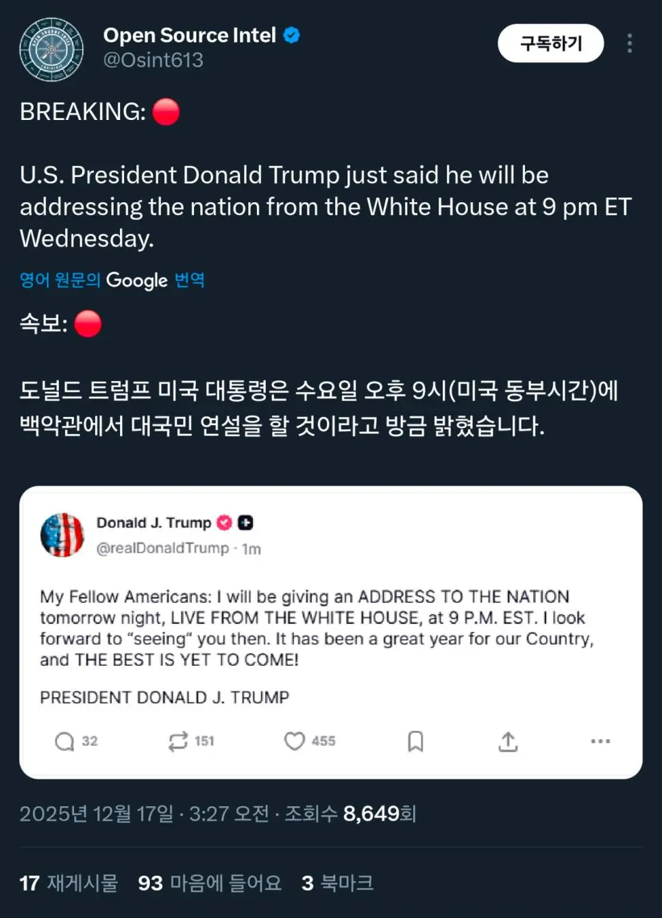 도널드 트럼프, 오후 9시 대국민 연설 예정 작성자 정보 최고관리자 작성일 2025.12.17 07:29 컨텐츠 정보 9 조회 0 댓글 0 추천 0 비추천 목록 워싱턴 D.C 시간으로 오후 9시니까...한국 시간으로 오전 10시네요. 0 추천 추천 비추천 0 비추천 댓글 로그인한 회원만 댓글 등록이 가능합니다. 이전 다음 목록
