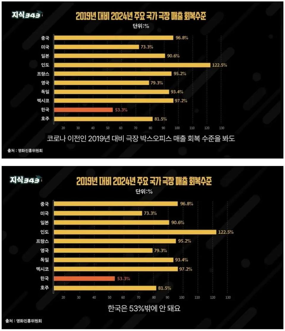 코로나 이후, 주요 국가 극장 매출 작성자 정보 최고관리자 작성일 2025.12.16 16:37 컨텐츠 정보 6 조회 0 댓글 0 추천 0 비추천 목록 2024년 기준 코로나 이전 대비 53% 0 추천 추천 비추천 0 비추천 댓글 로그인한 회원만 댓글 등록이 가능합니다. 이전 다음 목록