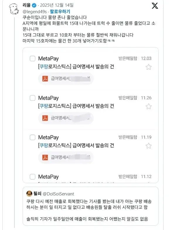 쿠순이가 말하는 쿠팡 현재 물류상황 작성자 정보 최고관리자 작성일 2025.12.16 16:07 컨텐츠 정보 5 조회 0 댓글 0 추천 0 비추천 목록 0 추천 추천 비추천 0 비추천 댓글 로그인한 회원만 댓글 등록이 가능합니다. 이전 다음 목록
