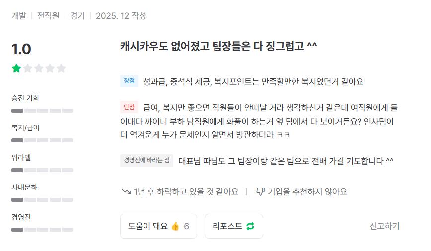 잡플래닛으로 영포티 팀장 내부고발하는 여직원들 작성자 정보 최고관리자 작성일 2025.12.16 10:33 컨텐츠 정보 13 조회 0 댓글 0 추천 0 비추천 목록 0 추천 추천 비추천 0 비추천 댓글 로그인한 회원만 댓글 등록이 가능합니다. 이전 다음 목록