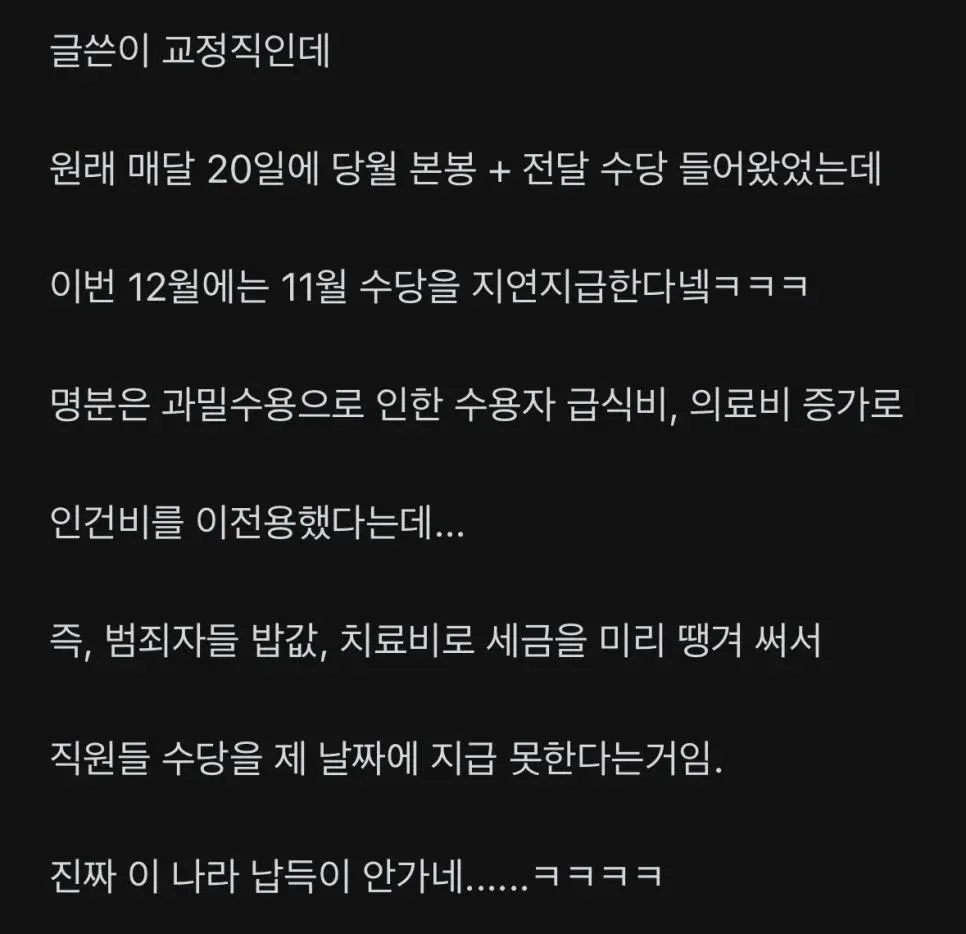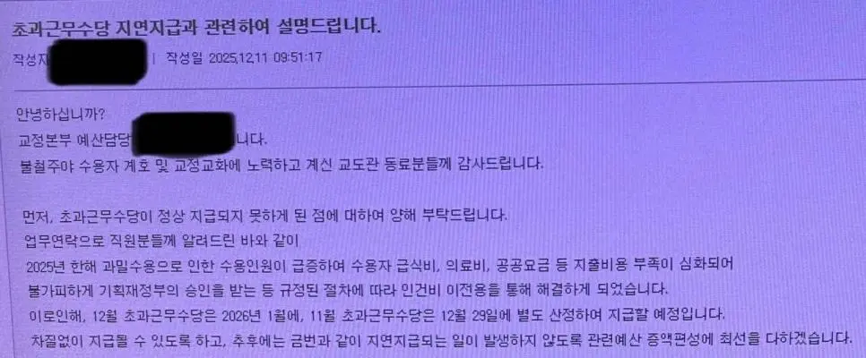 교정직 근무원 임금체불 작성자 정보 최고관리자 작성일 2025.12.13 19:41 컨텐츠 정보 8 조회 0 댓글 0 추천 0 비추천 목록 수용자 증가로 예산 부족해교정공무원들 인건비 전용해서 해결하고교정공무원들 11월 초과근무수당 9일 지연지급12월 초과수당은 1월에 지급(원칙대로면 회계독립원칙에 따라 연말 지급분은 무조건 연내 지급)ㅡㅡㅡㅡㅡㄷㄷ 0 추천 추천 비추천 0 비추천 댓글 로그인한 회원만 댓글 등록이 가능합니다. 이전 다음 목록