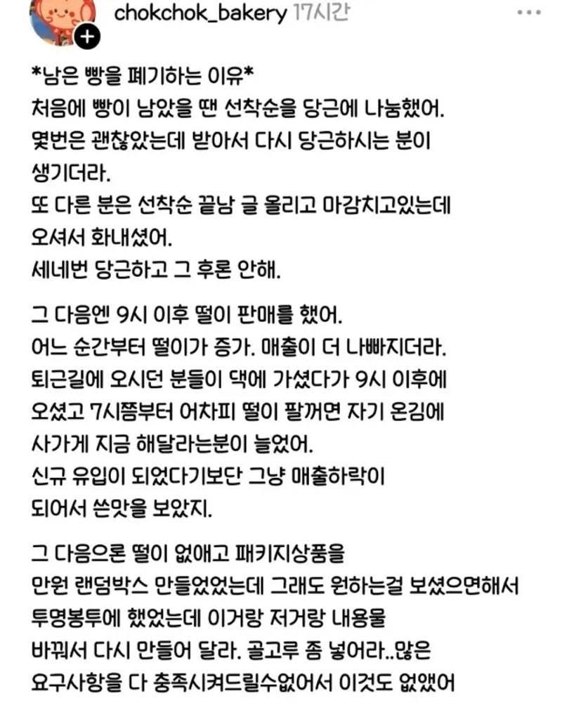 남은 빵을 폐기하는 이유 작성자 정보 최고관리자 작성일 2025.12.12 23:07 컨텐츠 정보 16 조회 0 댓글 0 추천 0 비추천 목록 0 추천 추천 비추천 0 비추천 댓글 로그인한 회원만 댓글 등록이 가능합니다. 이전 다음 목록