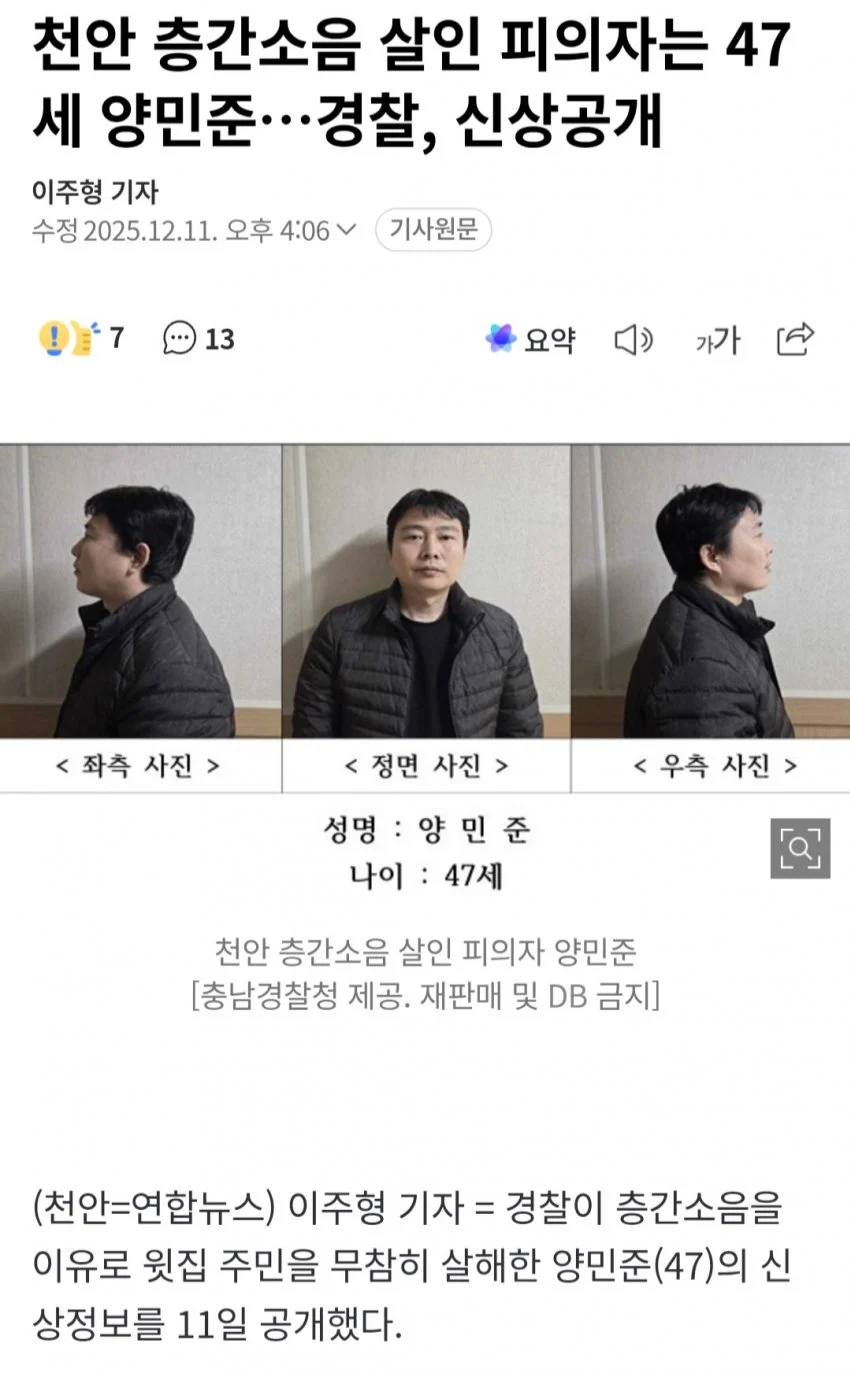 천안 층간소음 살인사건 범인 신상공개 작성자 정보 최고관리자 작성일 2025.12.11 17:41 컨텐츠 정보 6 조회 0 댓글 0 추천 0 비추천 목록 범인 양만준은 70대 이웃주민을 야외에서 흉기를 찌르고 관리사무소로 피해자가 대피하자 자신의 K3 승용차를 이용 관리사무소에 차량을 돌진하여 문을 부순 뒤 사무소 안에 있던 피해자를 흉기로 살해한 혐의 0 추천 추천 비추천 0 비추천 댓글 로그인한 회원만 댓글 등록이 가능합니다. 이전 다음 목록