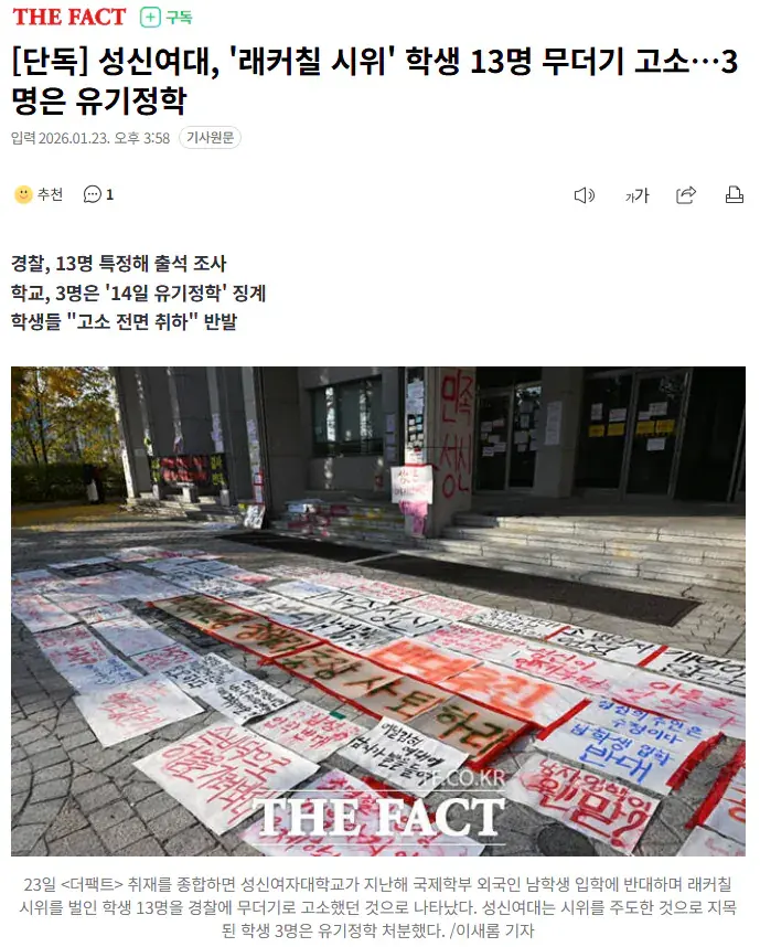 성신여대, '래커칠 시위' 학생 13명 무더기 고소…3명은 유기정학 작성자 정보 최고관리자 작성일 01.24 10:21 컨텐츠 정보 2 조회 0 댓글 0 추천 0 비추천 목록 0 추천 추천 비추천 0 비추천 댓글 로그인한 회원만 댓글 등록이 가능합니다. 이전 다음 목록