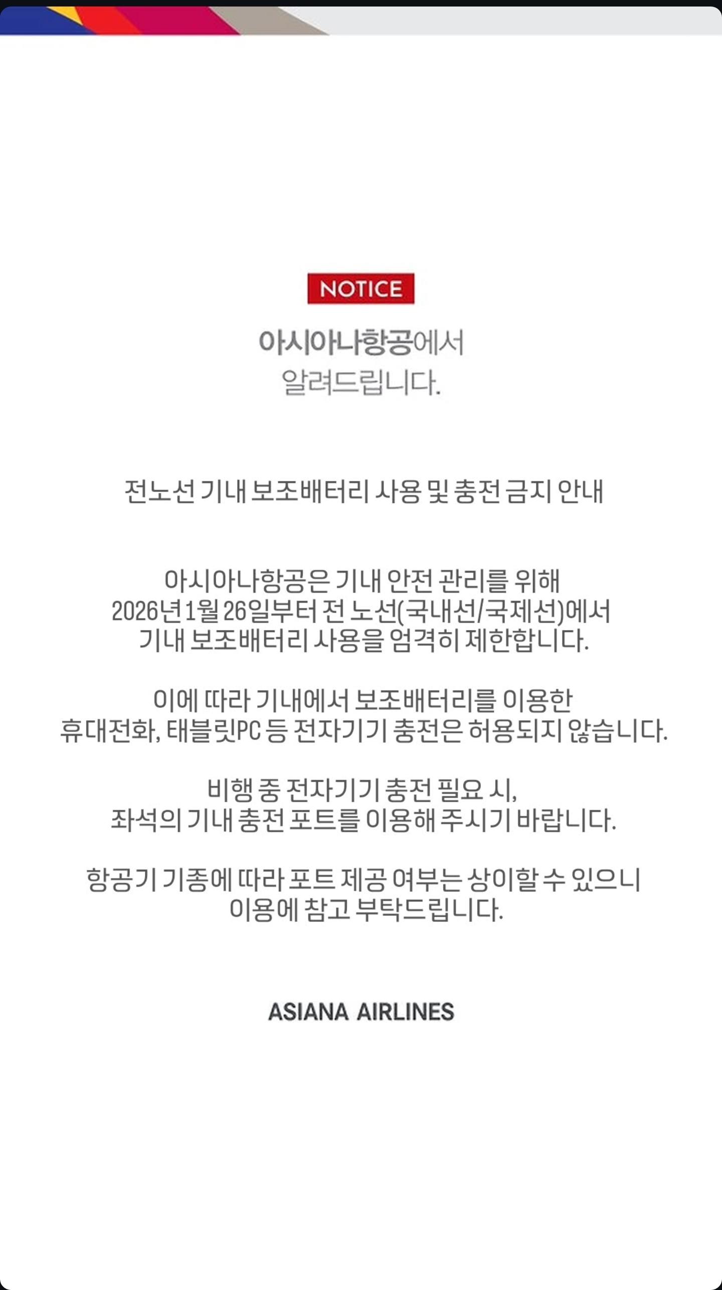 아시아나항공, 1월 26일부터 기내에서 보조배터리 사용이 전면 금지 작성자 정보 최고관리자 작성일 01.25 01:33 컨텐츠 정보 8 조회 0 댓글 0 추천 0 비추천 목록 0 추천 추천 비추천 0 비추천 댓글 로그인한 회원만 댓글 등록이 가능합니다. 이전 다음 목록