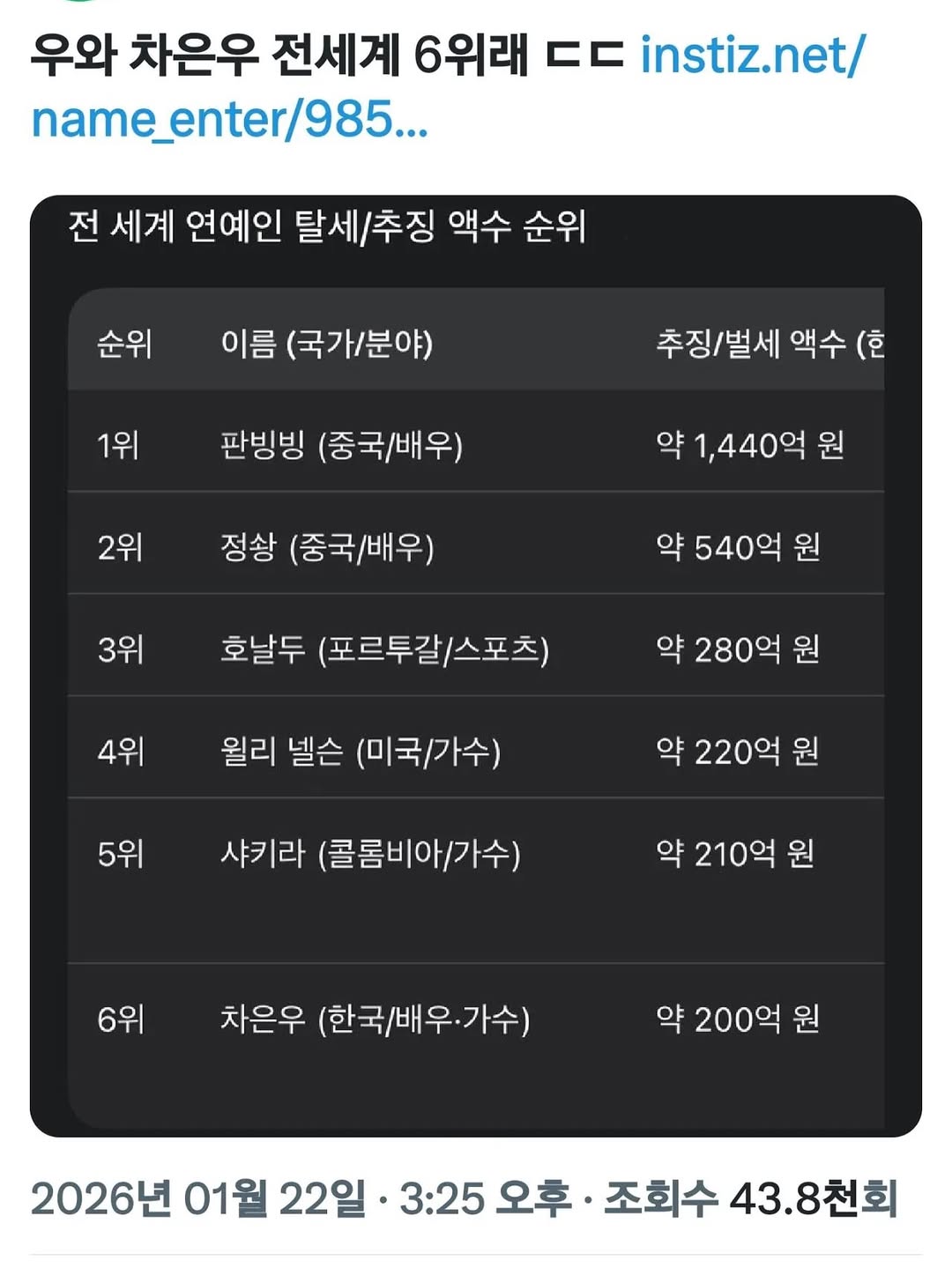 탈세 사실이면 전세계 연예인 6등 작성자 정보 최고관리자 작성일 01.25 11:25 컨텐츠 정보 14 조회 0 댓글 0 추천 0 비추천 목록 0 추천 추천 비추천 0 비추천 댓글 로그인한 회원만 댓글 등록이 가능합니다. 이전 다음 목록