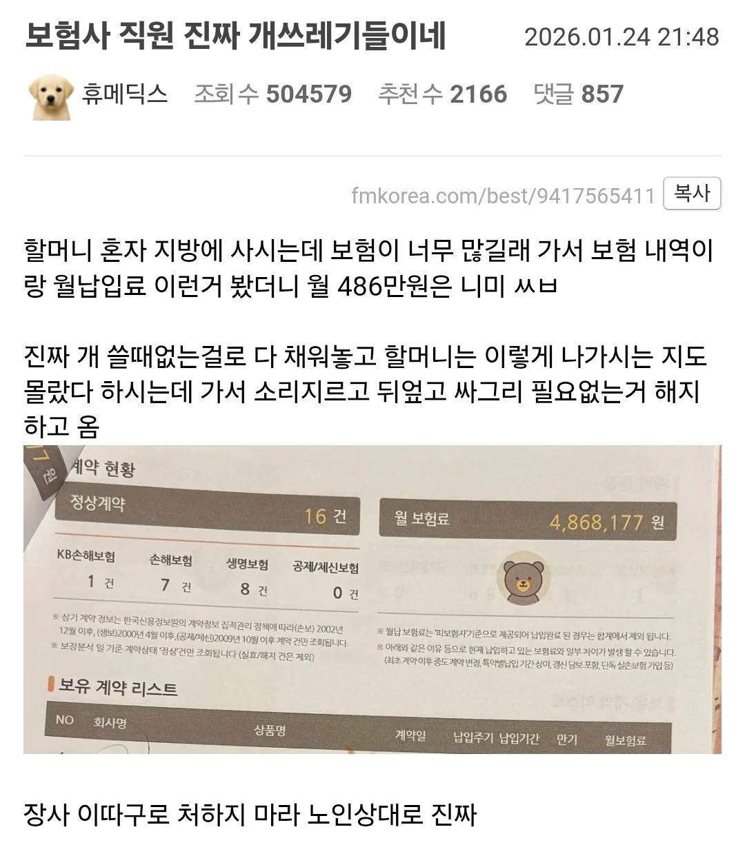 노인네 상대로 보험 너무한 거 아니냐 작성자 정보 최고관리자 작성일 01.26 13:46 컨텐츠 정보 14 조회 0 댓글 0 추천 0 비추천 목록 노인네한테 저축성 20년 납...보험사 여러가지인거 보니 설계사가 작업친듯 0 추천 추천 비추천 0 비추천 댓글 로그인한 회원만 댓글 등록이 가능합니다. 이전 다음 목록