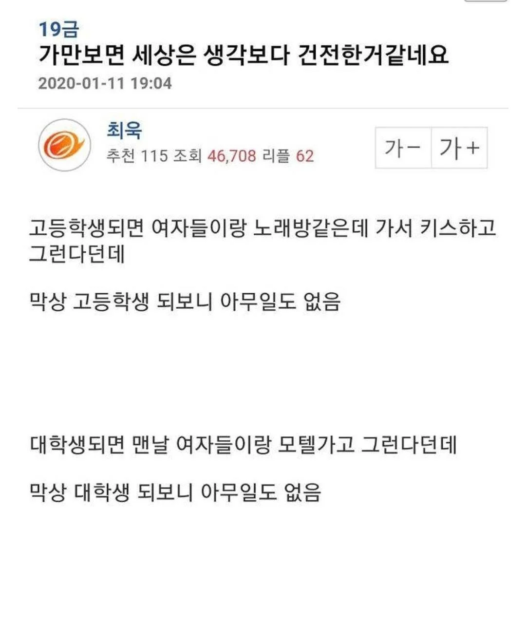 가만보면 세상은 생각보다 건전한거 같음 작성자 정보 최고관리자 작성일 01.27 09:45 컨텐츠 정보 23 조회 0 댓글 0 추천 0 비추천 목록 0 추천 추천 비추천 0 비추천 댓글 로그인한 회원만 댓글 등록이 가능합니다. 이전 다음 목록