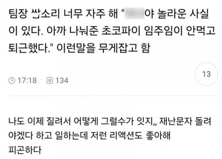 팀장 헛소리 너무 자주해 작성자 정보 최고관리자 작성일 01.29 17:16 컨텐츠 정보 16 조회 0 댓글 0 추천 0 비추천 목록 0 추천 추천 비추천 0 비추천 댓글 로그인한 회원만 댓글 등록이 가능합니다. 이전 다음 목록