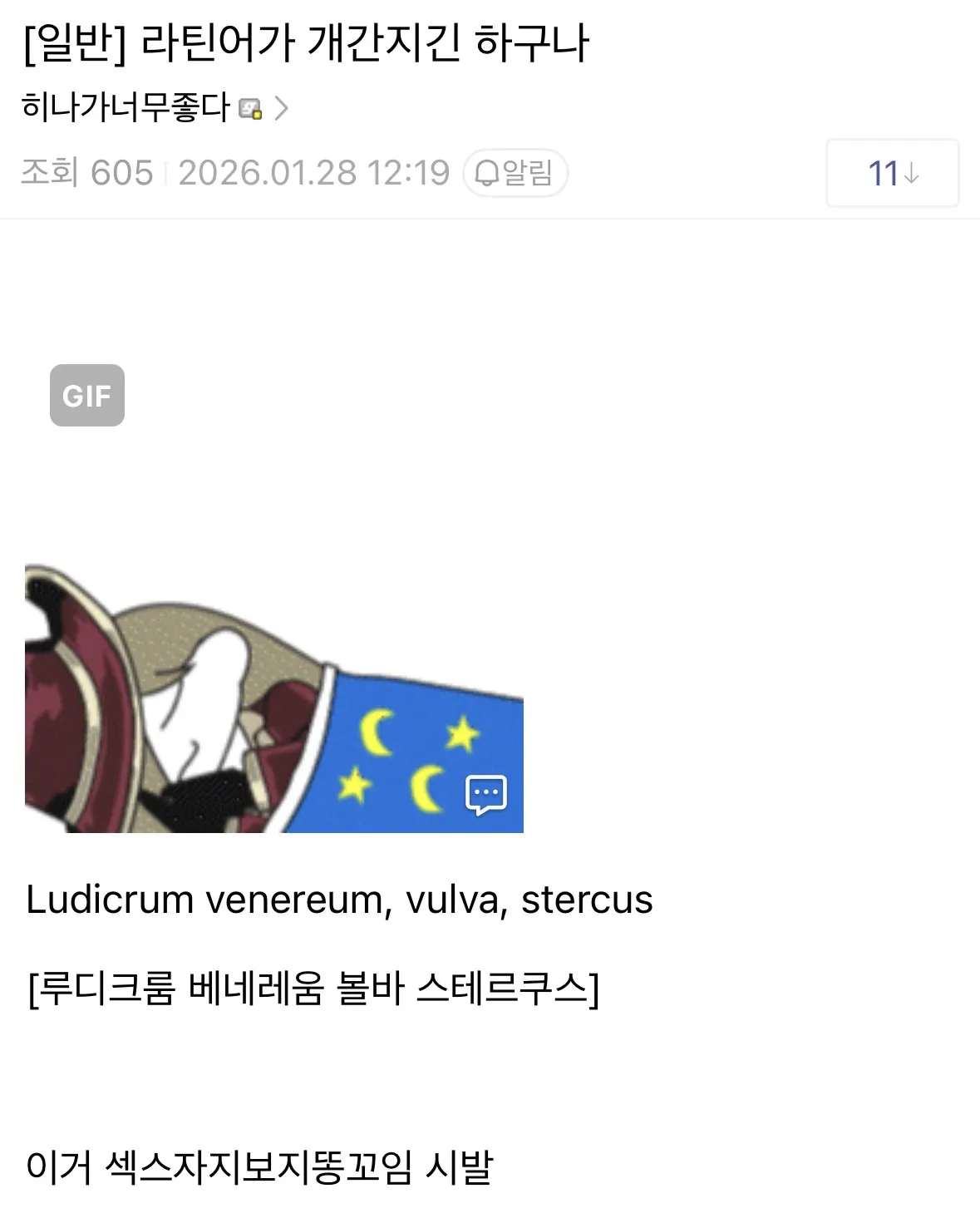 라틴어가 개간지긴 하구나 작성자 정보 최고관리자 작성일 01.29 18:00 컨텐츠 정보 12 조회 0 댓글 0 추천 0 비추천 목록 0 추천 추천 비추천 0 비추천 댓글 로그인한 회원만 댓글 등록이 가능합니다. 이전 다음 목록