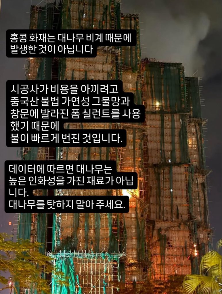 홍콩 화재, 대나무 비계 문제가 아니었다 작성자 정보 최고관리자 작성일 11.29 15:28 컨텐츠 정보 5 조회 0 댓글 0 추천 0 비추천 목록 홍콩 전통식 대나무 아시바가 아니라중국 싸구려 인화성 그물 때문에 불탄거라고 함대나무 비계는 인화성이 아니라 화재 후에도 멀쩡했다고.. 0 추천 추천 비추천 0 비추천 댓글 로그인한 회원만 댓글 등록이 가능합니다. 이전 다음 목록