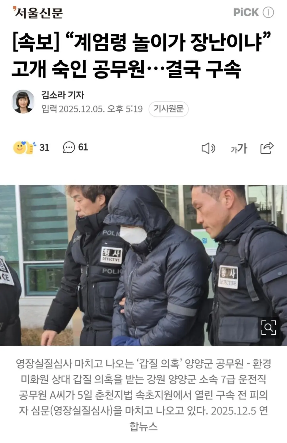 계엄령놀이 공무원 구속 작성자 정보 최고관리자 작성일 2025.12.06 13:30 컨텐츠 정보 8 조회 0 댓글 0 추천 0 비추천 목록 0 추천 추천 비추천 0 비추천 댓글 로그인한 회원만 댓글 등록이 가능합니다. 이전 다음 목록