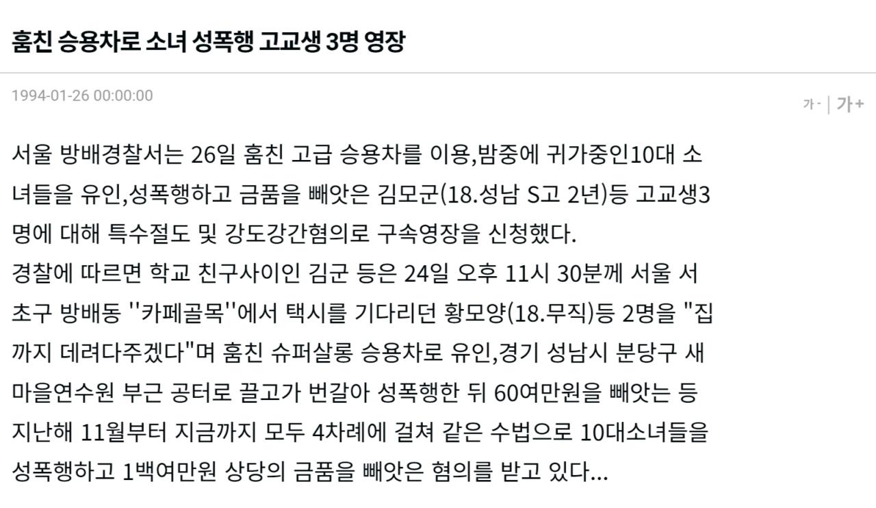 조진웅 1994년 사건 당시 기사 작성자 정보 최고관리자 작성일 2025.12.07 00:07 컨텐츠 정보 7 조회 0 댓글 0 추천 0 비추천 목록 https://plus.hankyung.com/apps/newsinside.view?aid=1994012600451 조진웅 76년생 1994년 사건당시 18세 성남 서현고 재학중 0 추천 추천 비추천 0 비추천 댓글 로그인한 회원만 댓글 등록이 가능합니다. 이전 다음 목록